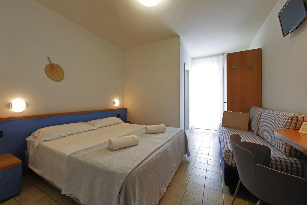 Una camera semplice e curata, ideale per chi vuole un soggiorno pratico ma confortevole. Il balcone affacciato sul giardino è perfetto per prendersi un momento di relax dopo la spiaggia.